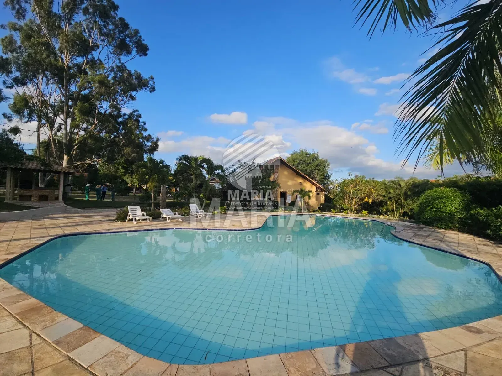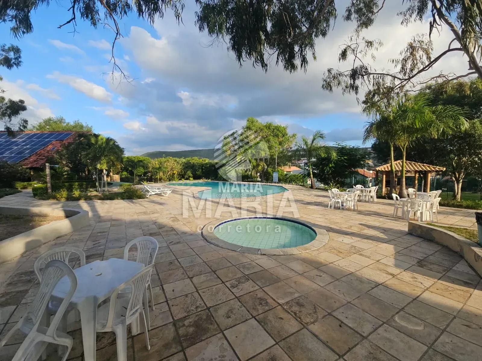 Área de lazer do condomínio com piscinas adulto e infantil, churrasqueira, salão de jogos, campo de futebol e parquinho